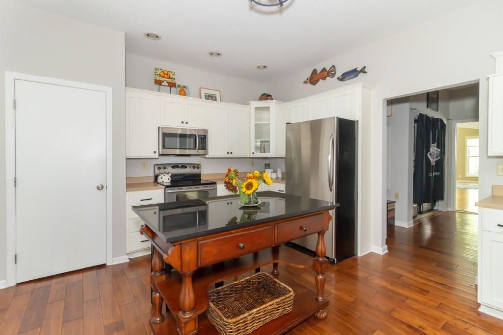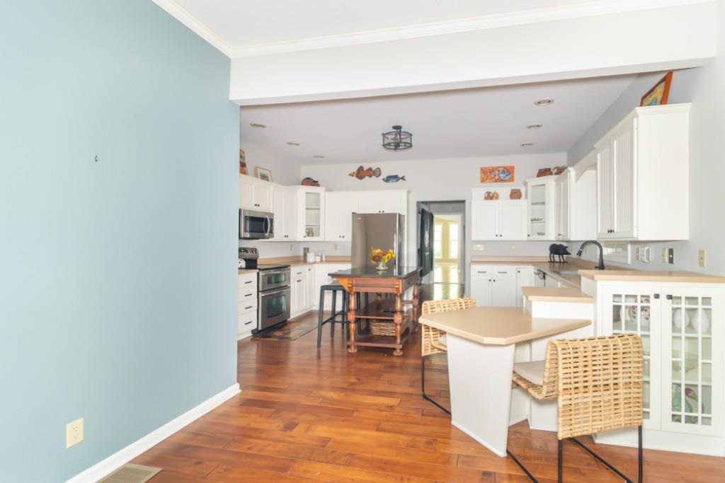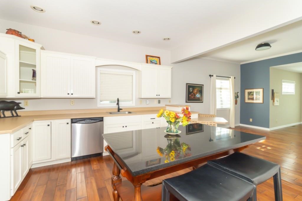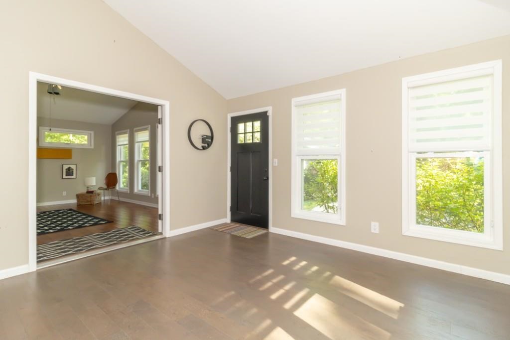 This craftsman-inspired home offers timeless charm and modern updates on a scenic 1.3-acre lot that feels like your own private retreat. Nestled among lush, wooded trails that lead to the back of the property, the setting provides both seclusion and direct access to Westwood Golf Course. The home features an open, spacious floor plan with two large living spaces, a flexible bonus room, dining area, and two full baths. Hardwood floors, a large entry, and vaulted ceilings create a warm yet airy feel. The remodeled kitchen is a centerpiece with custom island, abundant counter space, eat-in bar, and ample cabinetry—all appliances, including washer and dryer, remain with the sale. The primary suite offers a generous walk-in closet and ensuite bath, while the back portion of the home showcases soaring ceilings, multiple rooms for flexible use (bedroom, office, or in-law suite), and an enclosed porch. Outdoor living is equally inviting with a large covered front porch, open patio, and expansive backyard designed for privacy and entertaining. Storage and hobby needs are well covered with both an attached 1.5-car garage and a detached 2+ car garage with opener—perfect for a workshop, sports car storage, or extra equipment. Every detail of this well-maintained property reflects thoughtful design and care. Custom window treatments, tasteful updates, and a beautifully landscaped setting complete the picture. Inside and out, this home offers a unique blend of comfort, functionality, and natural beauty.